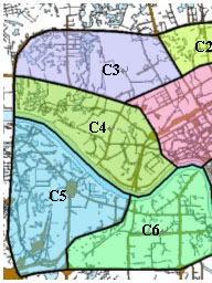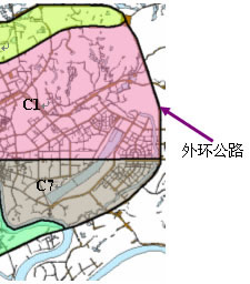 本文需要计算图1中所示的外环公路内绿地覆盖率。 3.1.2 区域划分 城市区域的划分主要是根据路网、水系、地势等地理要素,在矢量地图上,通过手工来划分,实验区域的划分情况如图3,将外环公路内分为C1、C2、C3、C4、C5、C6、C7等7个区域。