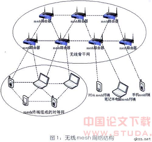 传统的无线接入技术中,主要采用点到点或者点到多点的拓扑结构。这种拓扑结构中一般都存在一个中心节点,例如移动通信系统中的基站、802.11WLAN中的AP等等。中心节点一方面与各个无线终端通过单跳无线链路相连,控制各无线终端对无线网络的访问就;另一方面,中心节点又通过有线链路与有线骨干网相连,提供到骨干网的连接。而在无线mesh网络中,采用网状mesh拓扑结构,也可以说是一种多点到多点网络拓扑结构。在这种mesh网络结构中,各网络节点通过相临其他网络节点,以无线多跳方式相连。 无线mesh网主要由两种网络节点组成:mesh路由器和mesh终端。Mesh路由器除了具有传统的无线路由器的网关/中继功能外,还具有支持mesh网络互连的路由功能。Mesh路由器通常具有多个无线接口,这些无线接口可以是基于相同的无线接入技术构建,也可以是基于不同的无线接入技术。与传统的无线路由器相比,无线mesh路由器可以通过无线多跳通信,以低得多的发射功率获得同样的无线覆盖范围。在无线mesh网络中,由mesh路由器互连构成无线骨干网,这个无线骨干网再通过其中的网关mesh路由器与外部网络如Internet相连。Mesh终端也具有一定的mesh网络互连和分组转发功能,但是一般不具有网关桥接功能。通常,mesh终端通常只具有一个无线接口,实现复杂度远小于mesh路由器。Mesh终端可以是笔记本电脑、掌上电脑、PDA以及手机等终端设备。Mesh终端之间互连可以构成一个小型对等通信网络。mesh路由器和mesh终端之间混合组网如下图所示: