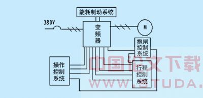 图1所示,提升机变频调速系统主要由变频器;行程控制;操作控制;能耗制动和抱闸制动等组成,变频器主要对提升机的升降实现变频调速等;行程控制主要对提升机的变速,停车和制动等进行精确的行程控制;操作控制主要完成提升机的提升启动,下降启动,故障复位及紧急制动等操作控制;能耗制动和抱闸制动主要实现提升机停车控制。