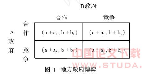 在我国现行的经济体制下,地方政府具有相当大的经济活动调控权和经济结果收益权,可以假设地方政府为一个相对独立的“经济人”,他将理性地作出预期成本收益分析,考虑如何把有限的资源投入到预期收益率最高的行业。设定一个博弈组合(如图1所示) 。假设: (1)地方政府具有经济人本性,在追求本地区利益最大化的过程中具有市场替代功能; (2)博弈过程中公平与利益相容; (3)地方政府行为是规范的,即地方政府是公开、公正、廉洁和高效的。其中,满足以下关系式: a2 > a1 > a3 > a4 ; b3 > b1 > b2 >b4 ; a4 ≤0; b4 ≤0。地方政府博弈的结果有两个纳什均衡:合作,合作和竞争,竞争。因此,地方政府之间存在同时竞争与同时合作两种博弈均衡。