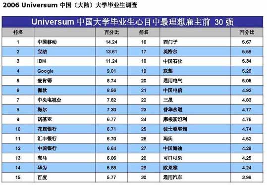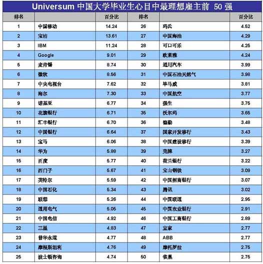 顶尖外企仍是毕业之后首选;中国移动名列理想雇主排行榜首位