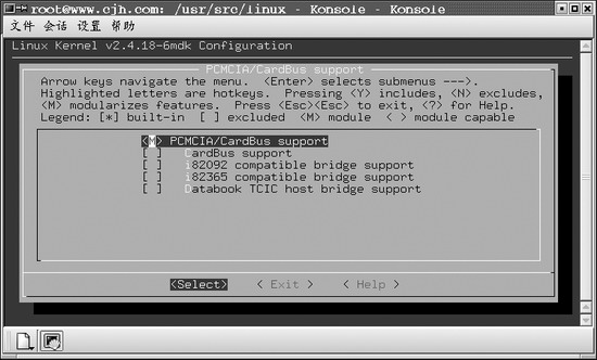 图3 menuconfig 配置界面 5.重新编译内核,并除去任何对内核提供PCMCIA驱动程序的部分。一般说来,在与其它程序和网络服务起作用时,PCMCIA-CS网卡服务库和驱动程序往往比基于内核的函数库更稳定,而且界面更友好一些。PCMCIA-CS源代码支持的网卡种类不断增多,附带的设备驱动程序的更新和改进通常比内核附带的驱动程序要快捷,运行也更稳定。另外正如前面提到的那样,如果需要构建/安装第三方驱动程序,那么在大多数情况下,该驱动程序需要安装并配置PCMCIA-CS库。从 Main Menu 转至 General setup→PCMCIA/CardBus support,将 PCMCIA/CardBus support选项由“yes”改成“no”(使用空格键将