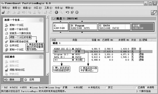 | 如今Linux不仅在服务器领域的应用取得较大进展,而且在桌面应用领域也有越来越多的人选择使用。下面就以Red Hat Linux 9.0为例,介绍如何与Windows XP组成双系统。 给Linux划分领地 由于Linux无法安装在Windows的分区上,所以必须在硬盘中分割出一块领地专供Linux使用,这里推荐用分区魔术师进行无损分区。为了方便讲述,这里先举一个实例来说明:装有Windows XP计算机有一个30GB的硬盘,共分三个区(C盘、D盘、和E盘),其中E盘有16.6GB(有约7GB可用空间)。我们的目标是将7GB的可用空间剥离出来专供Red Hat使用。 1.首先在Windows XP里启动分区魔术师,从主窗口可以看到磁盘分区的详细信息。单击右侧详细窗格里的分区E以选中它。 2.单击左侧任务列表里的“调整一个分区的容量”命令,即可弹出一个“调整容量/移动分区”对话框。 3.在该对话框的顶部有一个条状图表示分区E的使用情况,其中左侧的黑色条部分表示已用空间,右侧的绿色条部分表示可用空间。可以用鼠标直接拖曳绿色条部分对E盘容量进行调整。很显然,E盘的最小容量就是已用空间的容量(在小就要破坏原有数据了),减小的容量就成了自有空间。 4.单击“确定”按钮,回到主界面,此时我们可以看到新划分出的7GB自由空间。接下来的步骤非常重要。尽管这7GB的磁盘空间已经是“自由身”,但是它还是属于Windows的扩展分区,所以要将这7GB的自由空间从Windows扩展分区里划分出去。 5.单击扩展分区以选中它,如图1所示。用类似的方法将这7GB自由空间从Windows扩展DOS分区里划分出去。现在我们已经从Windows XP的领地里割出一块7GB的自由空间供Linux专用。
