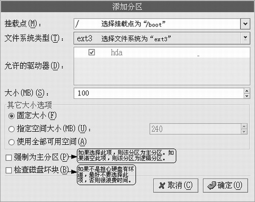 图2 选择安装类型 2.创建Linux分区 创建Linux分区是难点。此处选择“用Disk Druid手工分区”,在接下来的页面上选中刚刚划分出来的7GB自由空间,然后单击“新建”按钮,即可创建Linux分区。对于初学者,可以只分三个分区: (1)引导分区 在弹出的“添加分区”对话框上,在剩余空间创建引导分区,挂载点为/boot,容量可以是100MB,文件系统是ext3,如图3所示。