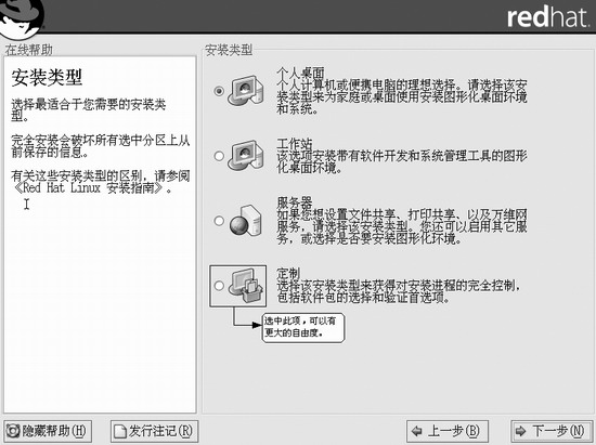 图1 将自由空间从扩展分区里划分出去 注意,一定要将自由空间从Windows扩展分区里划分出去,这是因为Linux的分区格式和Windows并不完全兼容。如果Red Hat所使用的磁盘空间属于Windows扩展分区,就会导致“水土不服”。很多朋友反映装上了Red Hat以后,发现Windows速度变得奇慢,就会归咎于Red Hat,其实根本原因在于分区的时候没有将自由空间从扩展分区里剥离出去。 实现Windows与Linux双重引导有多种方法: ◆ 对于具有双硬盘的用户,可以将Linux安装在第二个硬盘上(Windows自然是安装在第一个硬盘上),并且确保将GRUB(LILO)安装在第二个硬盘的主引导扇区,然后每次开机时在BIOS里指定从哪个硬盘引导即可。 ◆ 最常用的方法是借助Linux的引导装载管理器GRUB(LILO),自动接管双重系统的启动选单。 ◆ 可以借助Windows XP的NT引导程序ntldr、boot.ini来实现双重启动。这种方法的优点是今后删除Linux比较方便,而且符合我们的使用习惯;缺点是实现起来相对比较复杂,需要获取Linux系统的引导映像文件。 ◆ 可以选择不安装Linux的引导装载管理器(或者不要安装在主引导扇区),但是要记住在安装过程中一定要创建Linux启动盘。今后需要时,用这张启动盘引导系统进入Linux。 这里介绍了四种双重系统的实现方案,本文将分别介绍比较常见的第二和第三种方法。 使用Linux引导管理器 Linux有GRUB和LILO两种引导管理器。从Red Hat 7.2版本开始,GRUB取代LILO成为了默认的启动装载程序,可见GRUB有其过人之处。相对来说,GRUB的使用和配置更加简单,功能更加强大,而且是今后的发展方向。所以此处推荐大家使用GRUB作为双重系统的引导管理器。 假设使用Red Hat Linux 9.0的安装光盘进行安装。首先是修改系统BIOS设置,以启用光盘开机,然后用第一张Linux安装光盘引导系统,等出现欢迎屏幕时按回车,即可进入图形化安装界面。 1.选择定制安装 安装过程非常简单,一开始会提示选择安装语言(自然要选择熟悉的简体中文),然后系统会提示进行鼠标、键盘配置。一般Linux会自动检测出相关设备,无需更改。 接下来将进入安装类型选择页面,一共有五个选项,分别是个人桌面、工作站、服务器、定制和升级现存系统。这里我们选择自由度最高的“定制”安装类型,如图2所示。