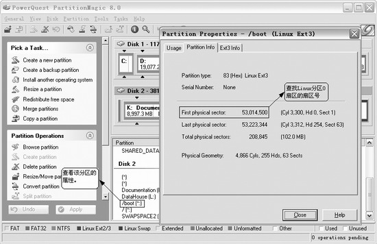 保存该文件,请别忘了将boot.ini、bootsect.rh件设置回系统、隐藏和只读属性,以免今后误操作。 需要指出的是,如果先安装Windows XP也可以,不过要记住两点: (1)在安装Linux引导管理器时,切记不要把引导管理器安装在主引导记录上(以免覆盖Windows的引导管理器); (2)千万记住要制作一张Linux引导盘。 后面的任务就简单了,安装完Red Hat Linux,用Linux启动盘引导系统进入Red Hat Linux,然后用同样的dd命令制作bootsect.rh文件。 2.在Windows XP环境下备份Linux引导扇区 尽管在Red Hat环境下备份Linux引导扇区比较简单,但是对于大多只熟悉Windows的朋友来说,还是显得有些麻烦。所以本文将介绍如何在Windows环境下备份Linux引导扇区。这里可以分两步走,首先是找出Linux引导扇区的扇区数,然后再将该扇区保存为一个备份文件。 (1)用分区魔术师查找Linux的起始扇区 要在Windows环境下保存Linux分区的引导扇区,就必须知道该引导扇区的扇区号。借助分区魔术师,在分区魔术师8.0的主窗口里定位Linux的/boot分区,用鼠标右键单击该/boot分区,选择“Properties”选单项。然后在打开的“Partition Properties”对话框切换到“Partition Info”标签页,找到“First physical sector”(第一物理扇区)的扇区数,如图6所示,本例是53014500。
