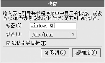 图4 引导装载器的配置 (1)改变默认启动系统 Linux引导管理器默认引导Linux,可以在这里加以修改,例如可以勾选Windows XP(此处是DOS)前面的“默认”复选框,也可以在安装完成后,修改/boot/grub/menu.ist文件达到同样目的。 (2)添加别的操作系统 有时候,GRUB不一定能够检测出系统里的所有操作系统,这时候就需要进行人工添加。单击如图4所示页面上的“添加”按钮,即可打开一个“映像”对话框,可以在“标签”文本框输入该操作系统的名称,例如“Windows 98”,在“设备”下拉列表指定该操作系统的系统分区所在的位置,并确定是否选择该操作系统为默认引导系统。 (3)编辑默认项目标签 可能大家早就看不惯Red Hat居然还把Windows XP看成是DOS。不过单击图4页面上的“编辑”按钮可以指定其标签,如图5所示。
