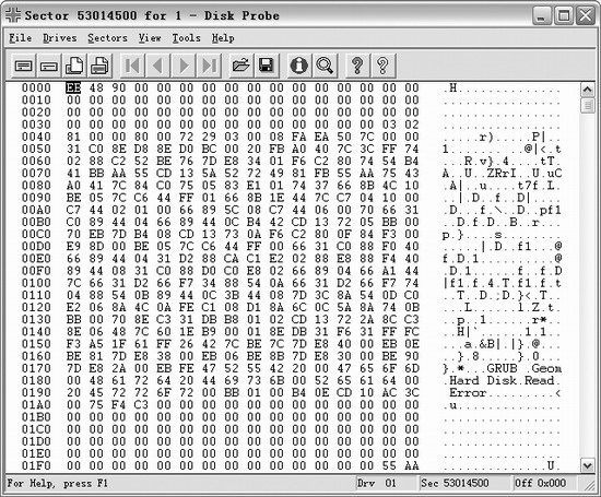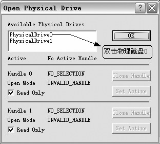 图7 选择合适的硬盘 可以看到该对话框里“Available Physical Drives”列表框里列出了两块磁盘,如果是单硬盘系统,将只列出PhysicalDrive0(第一块物理硬盘)。双击所需的物理硬盘,可以看到“Close Handle”和“Set Active”这两个按钮被激活,先单击“Set Active”按钮,然后再单击“OK”按钮,即可返回到主界面。 单击主界面上的“Sectors”选单→“Read”选单项,打开“Read Sectors”对话框。在“Starting Sector”文本框里输入刚才通过分区魔术师的扇区数(本例是53014500),在“Number of”文本框里输入1,然后单击“Read”按钮,则显示如图8所示的界面,这就是Linux的/boot分区的引导扇区的内容。