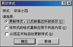 有时候我们要对应用了同一样式的若干段落进行相同的格式修改,而有时我们只想修改其中一段的格式而其他段落不变。可以通过设置或取消样式“自动更新”功能进行相应的操作。我们用以下的方法操作更方便:以“宋体小四”样式为例,若“宋体小四”样式具有“自动更新”功能,先将此功能取消。当我们修改了应用“宋体小四”样式的某一段格式,其他应用此样式的段落格式不发生变化。若想要其他应用此样式的段落格式发生相应的修改,单击“格式”工具栏上的“样式”框后回车,便弹出“更改样式”对话框(如图所示)。选择第一个单选框后确定。其他应用此样式的段落的格式发生相应的修改。