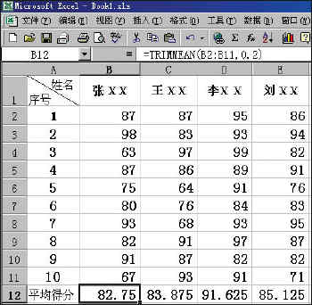 学校每年年末都要评选优秀员工,难免要对各教职工进行打分,把分数作为评优的依据。用Excel将所打分数逐一录入,并且需在打出的多个分数中,去掉一定比例的最高、最低分,再求出剩余分数的平均分作为最终结果。常规的做法一般是:对每个人所得分数分别排序,按比例删除最高、最低分,再求出剩余分数的平均分。这种方法对于有300多名教职工的学校来说,操作太麻烦了。其实用TRIMMEAN函数一步即可实现。 下面以计算四个教职工的分数为例(如图1所示),其中序号是打分票数排号。若想计算张、王、李、刘四个教职工的分数,假设需去掉最高、最低票数各为总票数的10%,那么只需在B12单元格输入“=TRIMMEAN(B2:B11,0.2)” ,即出现张XX的最后平均得分。其他利用填充柄拖动就可以了。其中0.2表示最高最低分各去掉10%,共去掉20%(即0.2)。 ![]()