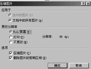 2.在打开的下拉菜单中执行“压缩图片”命令,在“压缩图片”设置框中,鼠标点击“更改分辨率”,将分辨率从缺省的“打印”选项修改为“Web/屏幕”,这样就能使显示分辨率从200dpi下降到96dpi。 3.将“选项”设置框中的“压缩图片”和“删除图片的剪裁区域”复选框同时选中。单击“确定”关闭“压缩图片”设置窗口。这样新保存的文件尺寸就比压缩之前小许多了(见图2)。 |