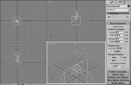 “Super Spray(超级喷射)”与“Spray(喷射)”粒子系统相似,它是从一个点向外发射粒子流,但功能更为复杂,它可以模拟火焰、烟雾、礼花、喷泉等等。将它的所有可编辑的参数区卷展栏逐个展开,可以看到它共有如下八项参数栏:“Basic
