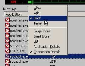 把没有必要访问网络的程序全都block(阻止)掉,如图。我的设置是把微软的程序除了ie,全都禁止访问网络(block)掉,这样可以防止一些木马,还有蠕虫病毒伪装成系统进程访问网络。实践证明,这样设置对你的正常上网没有影响。