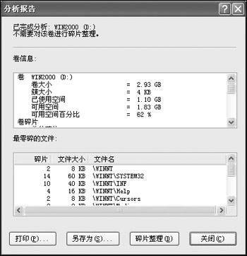 这时不要急于开始整理磁盘碎片,而应该先进行分析,以便决定是否需要进行整理,一般当磁盘碎片大于10%时就应该对磁盘进行整理从而提高其运行效能。我们首先点击“分析”按钮,几分钟后出来分析报告,然后点击“查看报告”即可查看磁盘碎片的详细情况(如图1),具体包括:总的碎片、文件碎片、最零碎的文件列表等等,如果你嫌看得不太清楚,还可以将它打印下来或保存到硬盘,对于没有打印机的朋友来说只能选择保存到硬盘,点击“另存为”将它保存到某个文件夹就OK了(如图2)。性急的朋友可能会问:保存下来有何用处呢?别急,继续往下看就明白了。