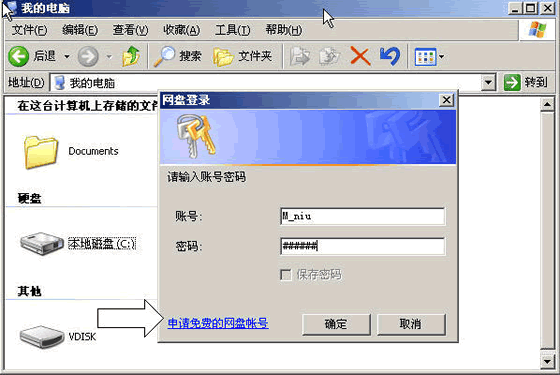 3.根据要求填入自己的用户名,密码、常用电子信箱等。这里注意不可以使用中文的用户名,而且尽量不要使用奇怪的字符或者标点符号。点击“确定”,即可完成注册。 使用“本地硬盘” 1.完成以上步骤后, M牛已经拥有自己的“本地硬盘”了。打开“我的电脑”就能在硬盘的几个分区中看到VDisk的盘符,双击它即可进行登录(图2)。 ![]()