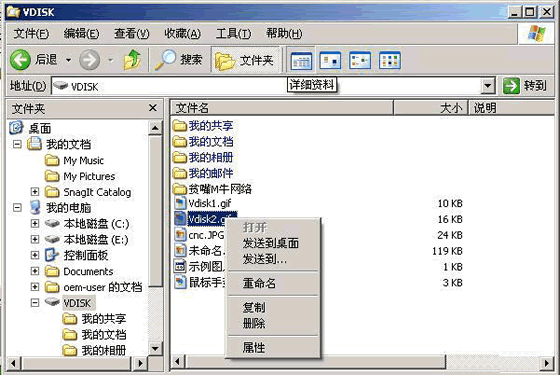 2.由于VDisk的设计思想就是模拟本地硬盘,所以实际操作和在本地硬盘上的操作一样。 新建文件夹 第一次登录后,建议按一下F5键刷新窗口或点击鼠标右键选择“刷新”,此时就会出现“我的文档”、“我的相册”、“我的共享”、“我的邮件”四个文件夹,你可以右键选择“新建文件夹”建立自己喜欢的文件夹。 M牛提示:由于VDisk实际上仍然是网络硬盘,建立新文件夹的速度与你的网速有关,可能需要的时间略长,请稍等片刻。 储存文件 “硬盘”的文件储存十分简便,你只须要找到自己想要储存的文件,先复制文件,然后来到“硬盘”里粘贴文件即可。这里,新建文件夹和存储文件的个数没有任何限制,并且支持长文件名、中文文件名和其他字符文件名。 查看文件属性 进入“硬盘”,在工具栏上依次选择“查看→详细信息”就可以看到文件的大小、类型,以及创建时间等信息。 打开文件 这里需要提醒大家,在“本地硬盘”中无法直接双击打开文件,你可以先将“硬盘”中的文件复制到自己的物理硬盘上,再进行相关的程序操作(图3)。执行完大体积文件的复制后,最好按F5键刷新一下“硬盘”窗口,这样,文件存放的排列顺序会整齐一些。 ![]()
