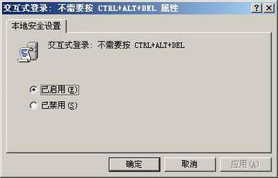 | 点击开始菜单→设置→控制面板→管理工具→本地安全策略,弹出“本地安全设置”窗口,在窗口的左侧(控制台树)中,点击“本地策略”左侧的[+]号,点击“安全选项”。“本地安全设置”窗口的右侧则出现很多与安全有关的安全设置策略,在交互式登陆项目中,双击“不需要按Ctrl + Alt + Del”项,弹出属性窗口(参见图2),默认情况下为“已禁用”,点击“已启用”,然后点击[确定]。当再注销或重新启动电脑时,将出现图3所示窗口,直接显示登陆窗口而无需按Ctrl + Alt + Del 组合键,即改变了Windows 2003默认的登陆方式。此时,仅按回车即可(假如没有密码的话)。 ![]() 图 1 ![]() 图 2 ![]() 图 3 当然,在“本地安全设置”窗口右侧的交互式登陆项目中,还可以双击“不显示上次登陆的用户名”来登陆,这个选项很好,当你登陆了本机,但在表面上又不想让别人知道你登陆过时,可以在此选项属性窗口中改为“已启用”,否则系统将自动存储上次登陆过的用户的名字。 |
