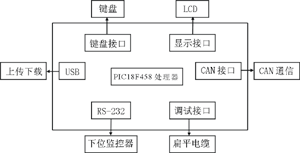 CAN(Controller Area Network)即控制器局域网,是国际上应用最广泛的现场总线之一。作为一种技术先进、可靠性高、功能完善、成本合理的远程网络通信控制方式,CAN 已被广泛应用在汽车电子、自动控制、智能大厦、电力系统、安防监控等各领域。目前,CAN总线技术在工程机械上的应用越来越普遍,欧洲新开发的大型工程机械基本都采用CAN现场总线控制,从而提高了整机的可靠性、可检测性、可维修性和智能化水平。 CAN总线的核心是嵌入式智能监控器及其CAN节点的通信协议。下面着重介绍我们研制的智能监控器的网络结构及通信协议。本文所介绍的智能监控器已成功应用于国家863项目“挖掘机机电一体化及制造信息化(2003AA430200)”,已得到有关专家的充分肯定。 1 硬件及网络结构 硬件结构如图1所示。处理器采用微芯公司的PIC18F458,接口包括一个USB接口、一个串行接口、一个CAN接口和一个调试接口。人机界面包括一个4×4键盘和320×240的LCD显示屏。