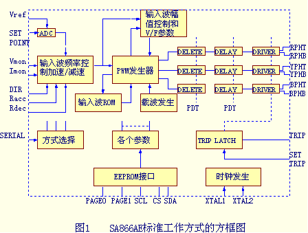 图1是SA866AE内部标准工作方式的框图。ADC是模数转换器,具有16位的精度,它将SETPOINT脚上的直流电压信号转换成相应的数字量控制PWM的输出频率,Vref是ADC的参考电压。DIR用于调节输出正弦波的相序。Vmon和Imon输入都是模拟量,起到保护的作用,它也可