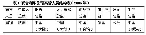 | 跨国企业人力资源管理一般分为4种模式:1 . 民族中心主义,即人员管理模式偏向母国模式,多在海外子公司的重要管理岗位上安置母国员工;2 . 多中心主义,子公司根据当地环境采取合适的人力资源政策,其重要管理岗位可以由东道国员工承担,这实质上是本土化的一种做法;3 . 地区中心主义,子公司按地区进行分类,子公司的管理人员由本地区任何国家的员工担任;4 . 全球中心主义,即在全球范围内配置母国人员、东道国人员和第三国人员。 成功的在华跨国企业都在采用哪些人力资源管理模式?为什么要采取这些模式?这些模式是否对走出去的中国企业有借鉴意义? 笔者以进入中国多年的10家《财富》五百强企业为研究对象,行业包括:快速消费品、电信、食品、家用化学品等。通过对这些公司的CEO或人力资源总监的访谈,得出以下看法。 基于成本考虑的本土化模式 有些跨国企业出于成本考虑采取了本土化的高管人员设置模式,这些跨国企业的本土化程度比较高。如:研究中的联合利华公司在高管人员设置上遵循中国子公司本地的人力资源管理习惯,公司主要雇用或选拔中国人作为高级管理人员(见表1),公司60%的高管人员是由中国人来担任的。不过联合利华公司认为为了更好地贯彻公司的发展战略和管理模式,子公司的总裁应由母国管理者承担,当地管理人员不应染指这一层次的管理职位,所以中国区的总裁还是由欧洲的本土人员来担任。此外,我们访谈的GE公司也属于该种情况。