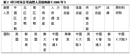 出于战略考虑的全球中心模式 出于战略考虑,可口可乐公司在中国采取了全球中心的策略,目前的中国区总裁是英国人。各部门的高级管理人员基本上来自世界各地(见表2)。