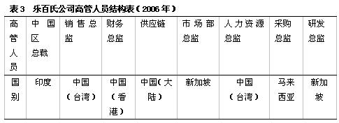 可口可乐公司的全球中心模式是在世界范围内招聘和选拔雇员,满足当地对高管人员的需求,同时在全球范围内培养和配备人才。可口可乐公司将人力资源管理的重点放在协调全球目标与当地反应能力上,将文化差异转化为企业经营的机会,使用不同国家的高管人员来提高企业的创造力和灵活性,并为有潜质的管理人员提供成长的机会。所访谈的爱立信公司也是采取全球化的人才设置策略。 基于地区合作的地区中心模式 并购企业沿用母公司原来的高管人员设置模式,没有完全本土化。2000年3月,法国的达能集团收购了乐百氏公司的54.2%的股份。新收购的乐百氏公司在中国设置的高管职位遵循原来的母国模式——按照地区配备,从整个东亚地区来设置。由来自香港地区、台湾地区、马来西亚、新加坡、印度的人员组成,中国子公司的高管人员也可以在整个东亚地区来任职。各子公司的经理人员在本地区的流动,可以加强地区内部各子公司的合作,而且有利于逐渐向全球中心的人力资源管理模式过渡(见表3)。