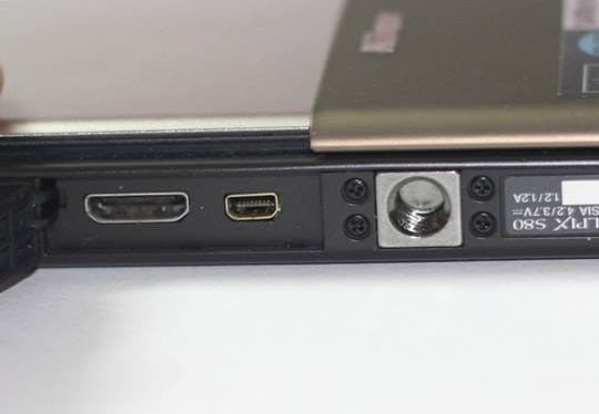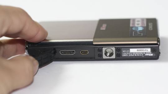 由于支持720p高清视频拍摄,除AV输出、三脚架螺纹接口还配备了HDMI接口。