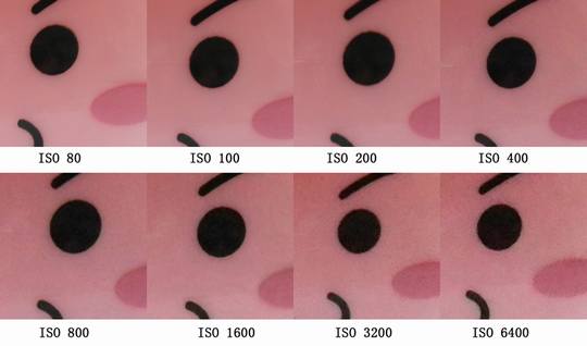 从细节图中我们可以直观了解到,在ISO80-100阶段,画质细腻,锐度、色彩层次较好;ISO200-ISO400,各方面均控制良好;从ISO800开始,画质明显下降,开始出现小噪点,在可以接受的范围;而ISO1600-6400范围内,锐度大大降低,玩偶的鼻子边缘模糊,部分细节缺失,色彩也有不同程度失真,噪点变得明显。但是对于同级别的DC来说,S80在ISO表现还是可以的。