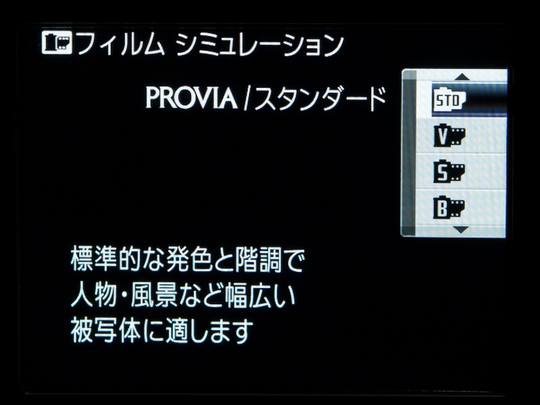 富士X100中关于PROVIA、Velvia、ASTIA等胶片模式选择的菜单