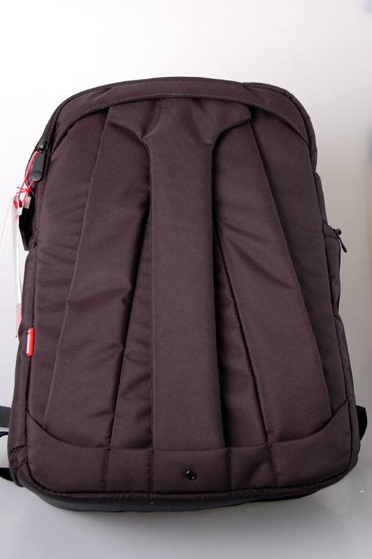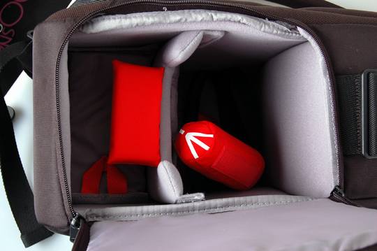 打开上层,拉开拉链,我们看到,这款包的储物空间较大,在包内侧还有一个内部为红色材质的小袋,可以用来装存储卡之类的小物件。不过,由此也可以看到,这款包并不能安放笔记本电脑。