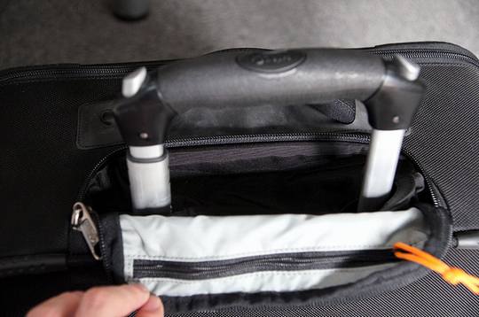 顶部的拉杆把手平时是隐藏在拉链内的,需要的时候拉出,非常方便,并且,这款拉杆还有个非常实用的设计。