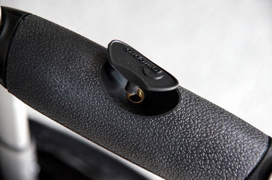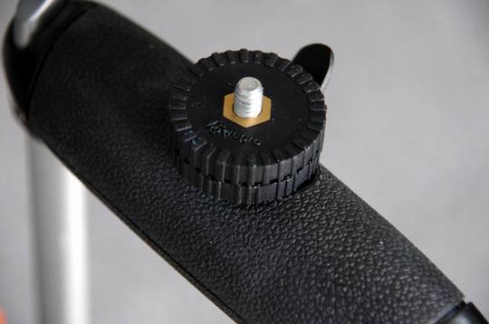 在拉杆握手处有个塑料小盖,掰开后,可以装上一个自带的一个1/4英寸-30线纹的标准相机简易云台。