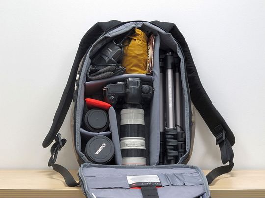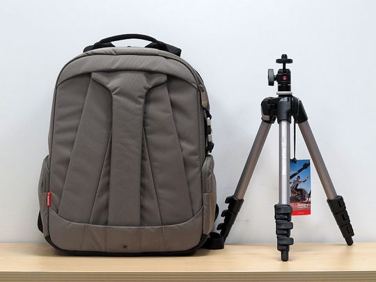 能中轴倒装或者能反折的三脚架(好像曼富图Compact MKC3-P01或者是MK393S-PD等),可以直接放进包的里面特有三脚架间隔。图中的包为Veloce V,如果是大一点的Veloce VII双肩背包,能放下更大的反折三脚架如捷信旅行者GT1542套装。1机3镜,最大的可以放小小白(Veloce VII能放下小白),还有位置放个人用品。