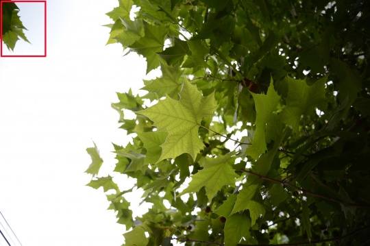 大光比逆光下,我们观察一下叶片与天空交接部分。从图中可以看到这款镜头全开光圈存在紫边,比较轻微,收缩光圈紫边并没有减轻。