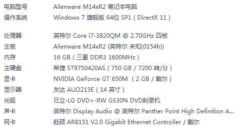 硬件配置上,这款Alienware M14XR2采用英特尔第三代Ivy Bridge平台酷睿i7-3820QM处理器,配备2X8GB大容量DDR3-1600内存以及750GB 7200转机械硬盘。在显卡方面,该机则采用英特尔HD 4000核显(CPU集成)与NVIDIA GeForce GT 650M独立显卡搭配的双显卡模式