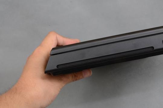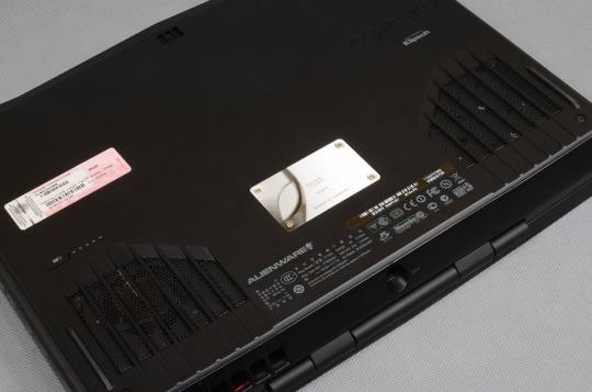 ALIENWARE M14XR2背面没有可拆卸的电池仓,为一体设计。两个散热窗分居两侧,我们隐约可以看到内部的风扇,而机身中间有一个金属铭牌。此外底部还配有电池电量查看窗口,将电量分为五格显示,用户即使不开启笔记本的电量情况(按下查看按钮即可查看)。