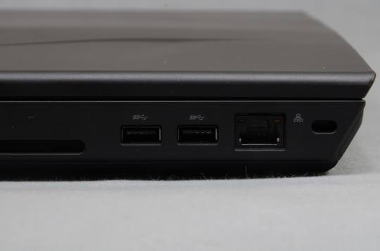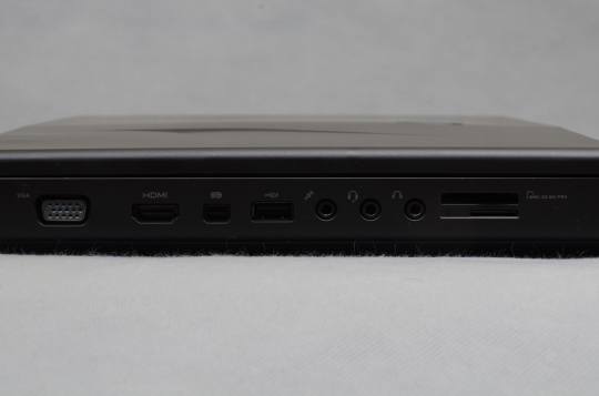 Alienware M14XR2的左侧有VGA接口、HDMI接口、Mini DisplayPort接口、USB 2.0接口、音频插孔和多功能读卡器。右侧则是吸入式刻录光驱、两个USB 3.0接口、网口和安全锁孔。