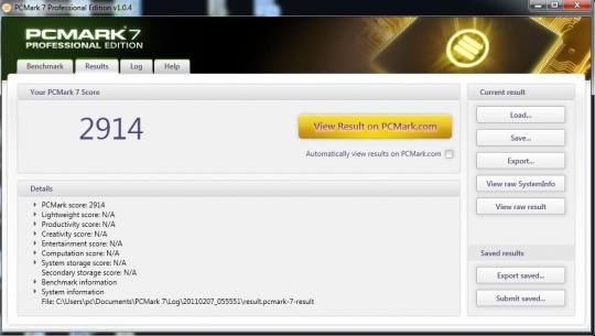 测试这款笔记本的整体性能,我们使用PCMark Vantage和PCMark 7作两款硬件测试工具,这两款测试工具,支持的测试功能包括Hyper-Threading and multicore CPUs数字式影像的解码与转码、文件压缩和解压、互联网浏览、3D处理、正文编辑、音像转码以及图象处理性能测试。PCMark系列软件可以说全方位的对电脑性能进行考察。在PCMark Vantage测试中,这款笔记本的得分为9193分(1024x768分辨率),PCMark 7的得分为2914分,整体表现非常不错。