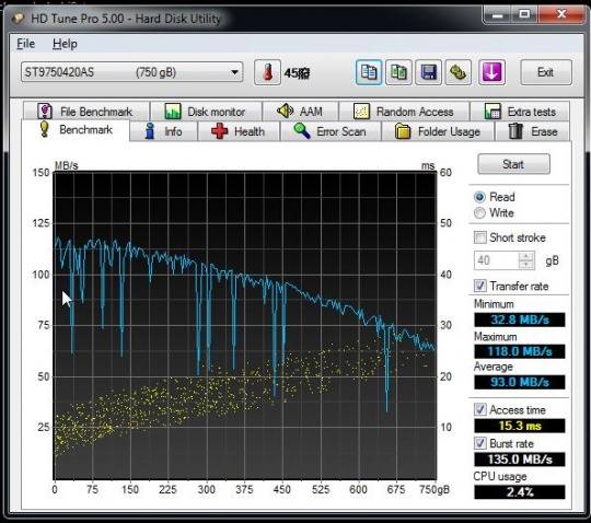 HD Tune测试显示,这块机械硬盘的最高读取速度为118MB/秒,最低为32.8MB/秒,平均读取速度为93MB/秒,整体表现达到7200转硬盘的正常水平。不过这样的性能可以说是这款笔记本的一个短板,想要更高性能可以换成速度更快的SSD固态硬盘。