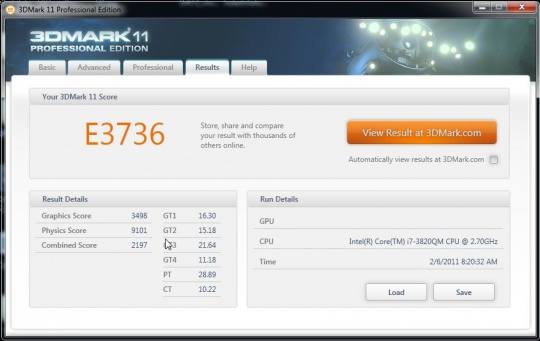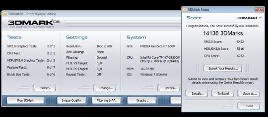 在3DMark 06测试过程中,我们采用设置(1280x800),GT 650M取得了15980分的好成绩,1600x900的最佳分辨率下可以达到14136分。3DMark Vantage包括两个图形测试项目、两个处理器测试项目、六个特性测试项目。在Performance模式测试中,这款笔记本最终得分破万,达到P10339。而3DMark 11是考察这款笔记本DirtectX 11的性能,该软件使用原生DirectX 11引擎,在测试场景中应用了包括Tessellation曲面细分、Compute Shader以及多线程在内的大量DX11新特性。我们同样使用默认设置,Alienware M14XR2的最后得分为E3736分,这样的成绩主流DX11 3D大型游戏可以降低特效和分辨率取得更好的流畅性。