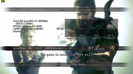 《生化危机5》主要对显卡的DX10性能进行测试, AAlienware M14XR2在1600×900分辨率下取得87.2fps的平均帧数和A级评价。