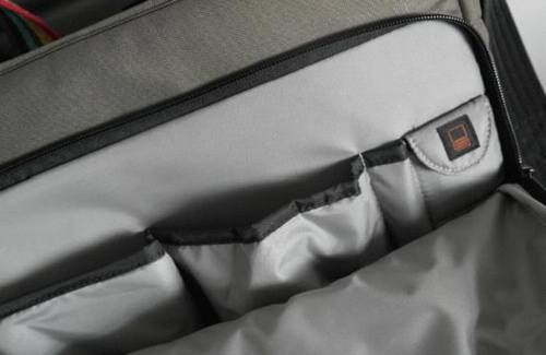 中间最大的空间就是用来收放摄影器材的核心部分了,两个可以调节的格档分成了三个晓得部分。我们完全可以根据自己器材的大小数量来调节空间。在包的最外侧有一个带拉锁的空间。里面可以用来放一些拍摄附件,比如存贮卡、清洁套装、滤镜等等。非常的实用。