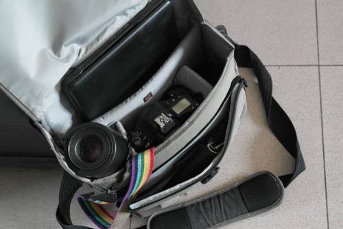 小编要特别介绍一下这款包对器材的收纳。为了能验证这款背包的背负能力,小编特意准备了一台大型的佳能1Ds Mark 3相机 一支100 2.8微距镜头,一支50 1.2 L镜头和一台14寸笔记本电脑以及若干摄影附件滤镜和钱包等等杂物。看看这个包究竟能不能把这些东西都放进去。经过小编的一番折腾(主要就是调整存放格档空间 )这些东西基本都可以放进这款单肩背包里,这让小编很惊诧。虽然外表看上去这个包并不大,但只要你合理的安排空间的话还是相当能装的。