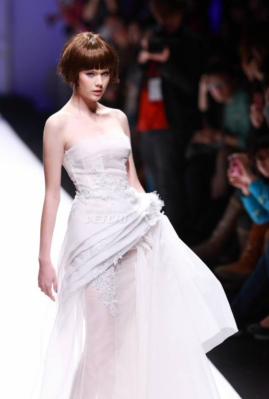 这是去年三月份在新锐设计师兰玉作品发布会上拍摄的,机位比较偏,但可以表现出模特和观众的互动。