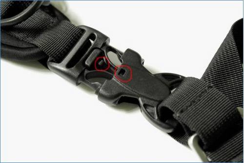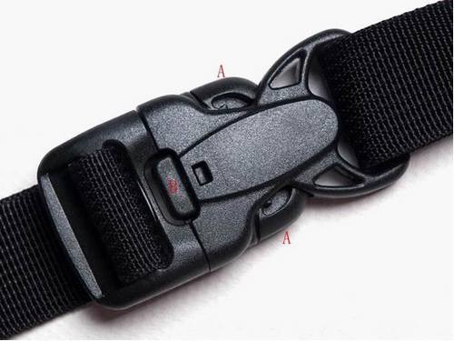 织带与肩垫通过尼龙接插件连接,这个接插件除了通常的两侧扣合/按压处(图中A处)以外,还多了个中间扣合/按压点(图中B处),需要用两只手才能同时按下三个位置,这样就避免了意外按压造成的脱落。由此可见设计者对器材安全的考虑是很用心的。如果插反了也是可以插进去的,但中间的扣合就失效了,所以在扣合的时候需要留意一下。
