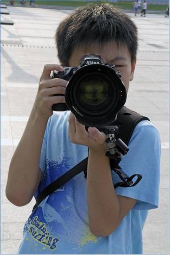 调整好背带的长度后,随手一举,很方便啊!小朋友开始拍摄了。