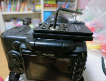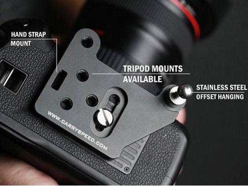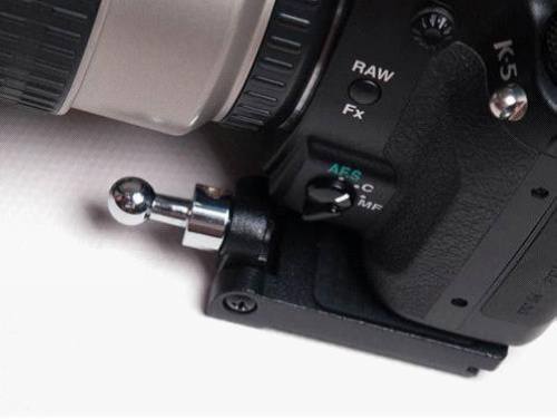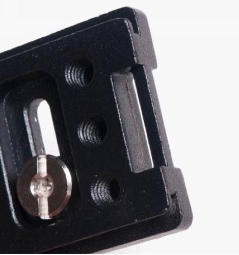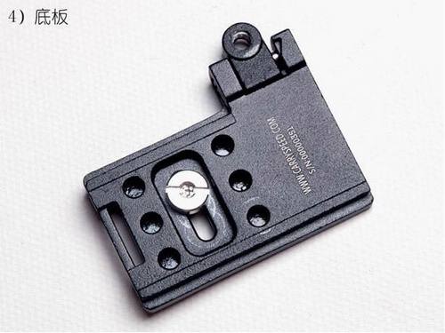 底板侧前方的孔是给球头用的,虽然你也可以把球头装在底部那6个脚架孔位置,但是这个位置更好:首先,当你使用竖拍手柄的时候,球头在这个位置不会影响竖拍时的握持;其次这个固定孔是可以翻转的,通常的使用状态是球头向下,当你不使用快摄背带时,球头和底板可以仍然固定在相机上,将球头翻转向前,这样不会影响将相机平放在桌面上或者插入摄影包中。但是与背带连接状态下,建议不要往前翻转,因为连接件的金属部分尺寸比较大,容易与镜头接触摩擦。