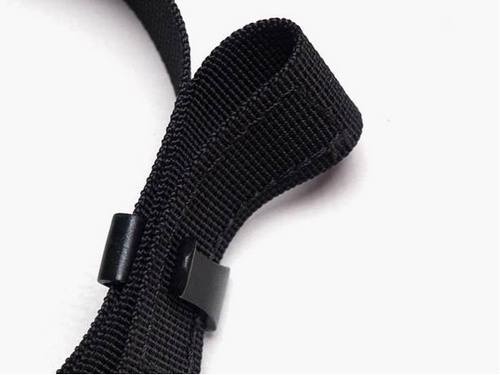最后是另一个卡子,织带绕过后方的接插件固定好需要的长度,就决定了快速调节装置拉到最高处时整个背带最长的长度,这时这个卡子用来固定和整理织带多余的部分。