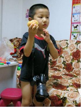回到家,已是第二天晚上接近九点,儿子正在玩儿我的富士F11,已经准备洗澡睡觉了,对这个沉重的单反没啥兴趣,想发个原装背带的对比图可又没有模特,只好给个桃子利诱一下。