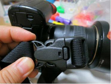 需要注意的是,肩带和织带连接时注意有凸点(左侧红圈内)的一侧对齐有空的这一侧,这样保证误操作打开连接而摔相机。正确连接后要是打开这个连接需要同时按住凸点后的那个突起和两侧才能打开。避免了误操作。